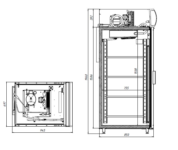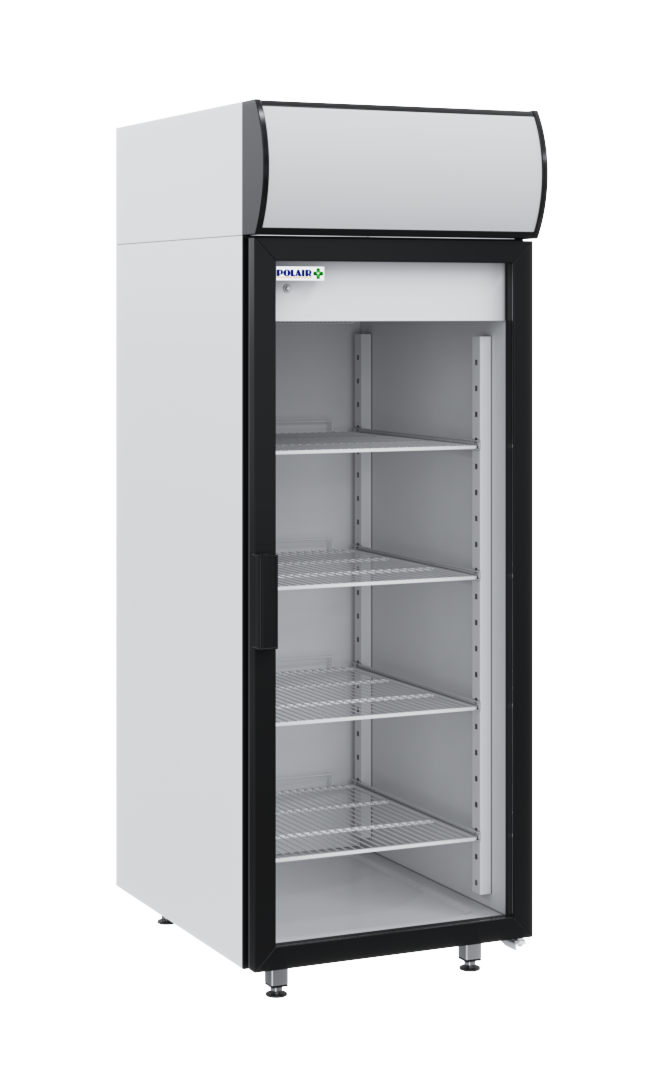 Просторный холодильный шкаф объемом 700 л с дверью в алюминиевой раме с заменяемым стеклопакетом оснащен внутренней вертикальной подсветкой и подсветкой канапе. Динамическая система охлаждения гарантирует равномерное охлаждение фармацевтических препаратов на всех полках шкафов. Оттайка осуществляется автоматически, вода испаряется из ванночки слива.