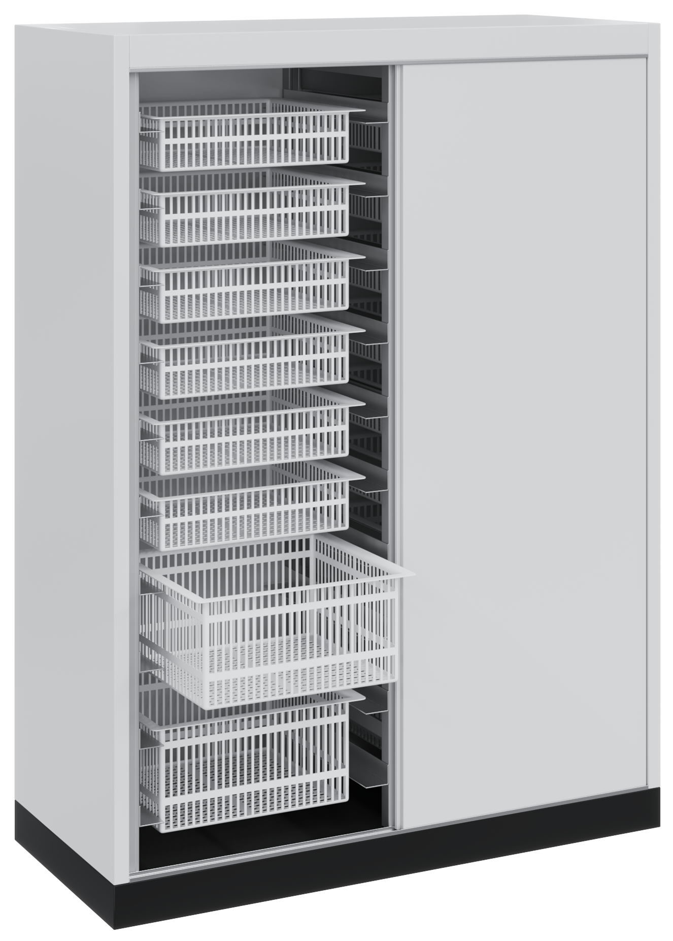 Прочная конструкция из анодированного алюминия обеспечивает высокую нагрузочную способность стеллажей. Скрытые крепежные элементы стеллажа в полной мере отвечают требованиям эстетики и гигиены.