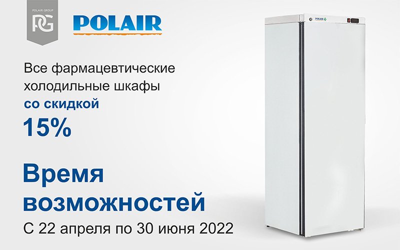 22 апреля 2022 г в рамках Акции* цены на ВСЕ Шкафы холодильные фармацевтические ТМ POLAIR будут снижены на 15%!