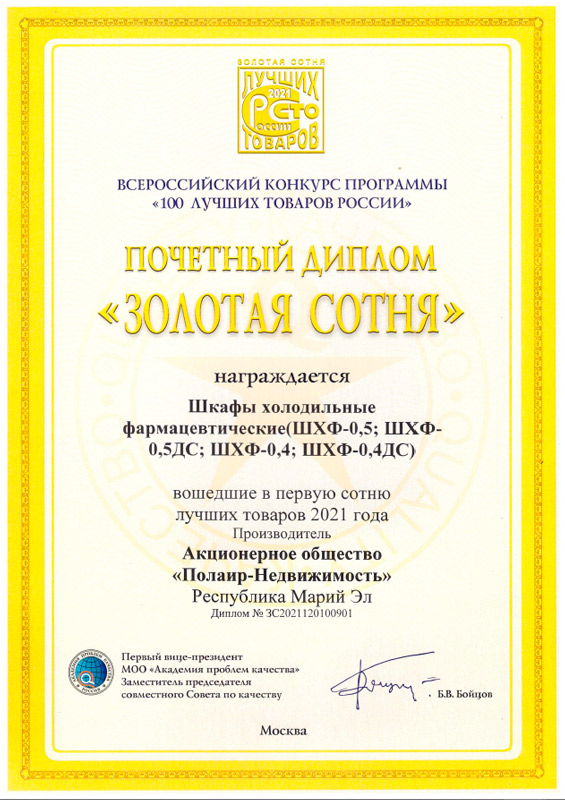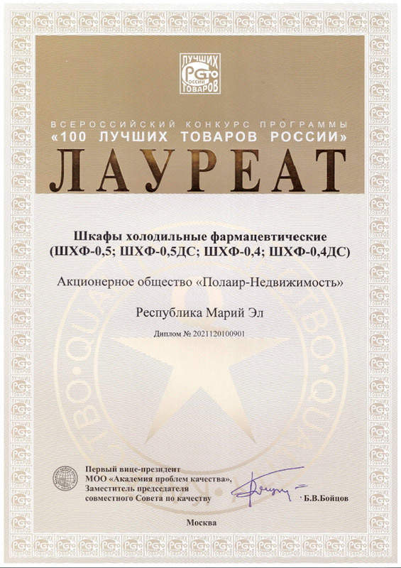 Звание ЛАУРЕАТА с правом использования золотого логотипа «100 лучших товаров России» завоевал фармацевтический холодильный шкаф ШХФ-0,4.